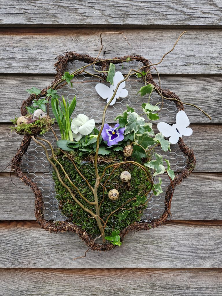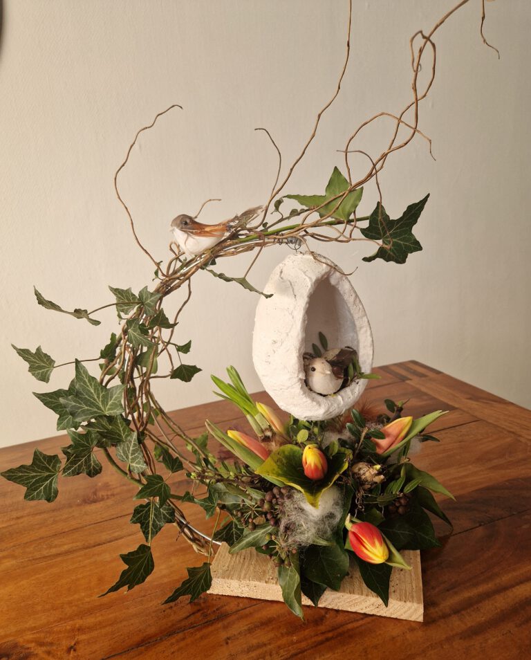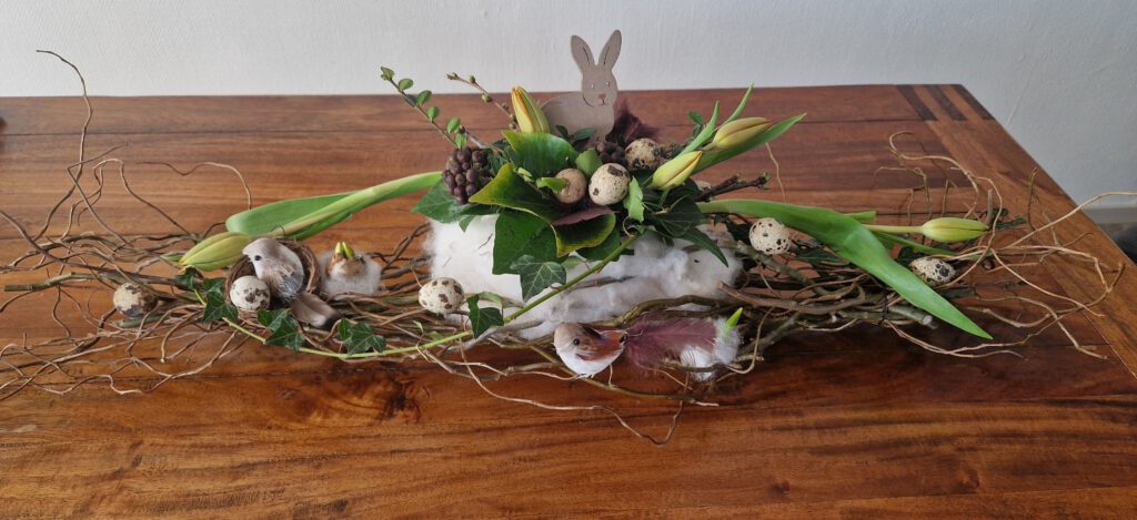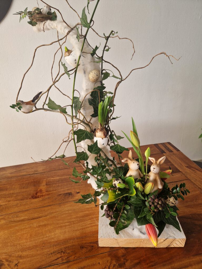 Langwerpig tafelstuk van takken met ei in het midden opmaken met voorjaarsbloemen €30,00 (bloemen kunnen afwijken van voorbeeld)